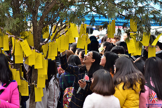 3月7日,我校“毓苑芳华”女生节拉开帷幕。在“歌舞韶华,不负青春”愿望征集与路演活动中,广大同学的积极参与,近千张真诚、幽默的女生心愿卡、目标卡挂满了两棵“愿望树”,引得师生纷纷驻足观看。