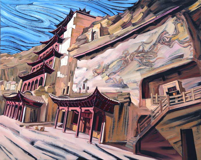 《莫高窟》由西北师大敦煌学院王延国创作,融入敦煌壁画元素,以强烈的线条和鲜明的色彩对比勾勒出莫高窟轮廓,着重展现了莫高窟在漫长时间长河中所历经的沧桑巨变。