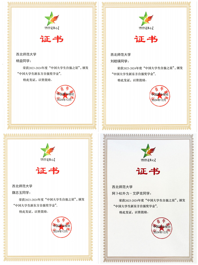近日,由共青团中央、全国学联指导,团中央基层建设部、中国青年报社主办,新东方教育科技集团、中国青年创业就业基金会协办的2023-2024年度“中国大学生自强之星”奖学金推报活动评选结果揭晓经学校推荐、省级初评、全国评审等环节,我校历史文化学院研究生魏志玉、历史文化学院本科生刘皑瑛、数学与统计学院本科生杨益、物理与电子工程学院本科生阿卜杜外力•艾萨克4名同学获评2023-2024年度“中国大学生自强之星”荣誉称号